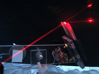 ![]() Here's a way-cool shot of the split pupil effect. Chuck shone a laser from the reticle to the edge of the lens, showing how much the light path bends when it goes through the lens. When you look through the lens along the lower line of sight (the nearly horizontal one), the reticle (down low on the left) actually appears to be out there in space directly ahead of you (see photo above). |